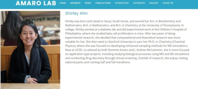 지난 2021년 4월 1일 경, 'UN세계여성과학자의 날' 특집 인터뷰이로 선정됐답니다. 아울러 2021년 5월 29일경, 미국화학회(ACS) 물리화학 부문 '젊은 연구자'상 수상자로 선정됐습니다. 2021년 8월 20일에는, 국제 학술지 네이처 화학은 코로나19가 어떻게 인체에 침투하는지를 단백질 분자 구조 변화 수준에서 규명을 한 연구에 제1저자로 등재됐답니다.