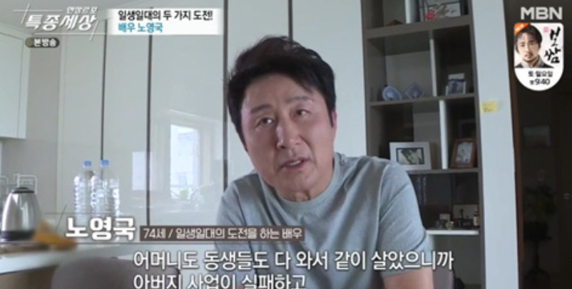 이에 대해 노영국은 "가정환경이 나만이 가지고 있는 특수한 환경이 있었다. 어머니도 동생들도 다 와서 같이 살았으니까. 아버지 사업이 실패하고"라고 털어놨습니다.